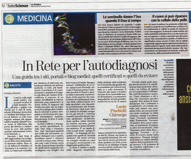 Tuttoscienze, l’inserto scientifico de La Stampa ha voluto dare uno spazio particolare con un taglio giornalistico/scientifico al dr. Lucio Piscitelli che ha spiegato i rischi in rete ed il pericolo dell'autodiagnosi.