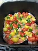 Questa e’ di ieri sera… salmone fresco con pomodorini gialli e rossi, un pizzico di sale e prezzemolo. Una bontà