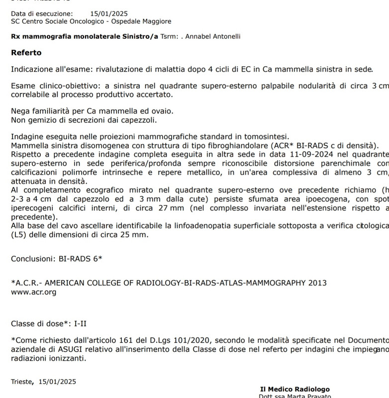 Buongiorno a tutti! Stamattina ho fatto la mammografia e l'eco e da quanto leggo mi sembra di capire che la situazione dopo un ciclo di chemio sia rimasta invariata... sono un po' sconfortata perché alle visite con l'oncologa al contrario aveva rilevato al tatto una sensibile riduzione... non so che pensareTi risponderà il DÒC che ha scritto più volte che una stabilizzazione, anche in assenza di una evidente riduzione , è da considerare sempre una buona notizia.