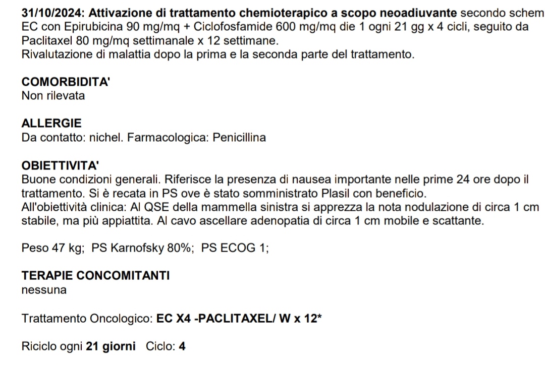 Mia madre 80enne stava terminando la seconda fase della terapia neoadiuvante (prima fase 4 ciclofosfamide più myocet ogni 21 gg poi seconda fase trastuzumab ogni 21 gg+ taxolo ogni settimana per 12 volte ) . È giunta a 5 cicli di taxolo ma la scorsa settimana hanno messo in pausa il tutto per cistite ( non emorragica ma dolorosa ed invalidante) prima da klebisiella ( il Ciproxin non è stato efficace ) poi ora da Escherichia coli ( oggi siamo in attesa di visita per definire la prossima mossa) le analisi emocromo , fegato , reni , tutto ok . Con l’oncologa stavo valutando la questione durata della terapia, ovvero se questa risulta essere praticabile o meno in caso di cistiti troppo ricorrenti ed invalidanti e se si potrebbe magari arrivare all’operazione prima venendo meno al protocollo imposto dei 12 cicli.