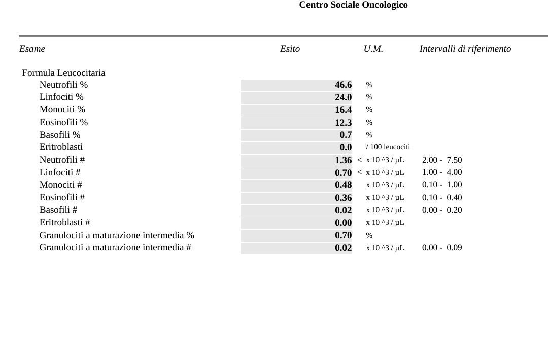 Oggi ho fatto il settimanale prelievo per la terapia e ancora una volta ho riscontrato un calo dei globuli bianchi. L'oncologa mi ha detto che può essere un effetto collaterale della terapia e che mi avrebbe fatto fare la chemio purché i valori complessivi dei neutrofili non fossero stati inferiori al 1.1000.