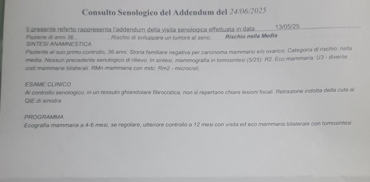 Grazie doc! Il fatto e' che pure il radiologo mi parlo' di sto seno complesso, ma non riesco a capire cosa si intende effettivamente. Mi sono impensierita con un controllo così a breve. Ma sono più tranquilla con la vostra opinione. Ultima cosa: ma pee la retrazione, la rm negativa e' sufficiente o per sicurezza lei farebbe fare tipo una biopsia della zona ? Forse percio' hanno detto controllo a 4 mesi. Pero' non ho proprio le forze per impanicarmi dinuovo