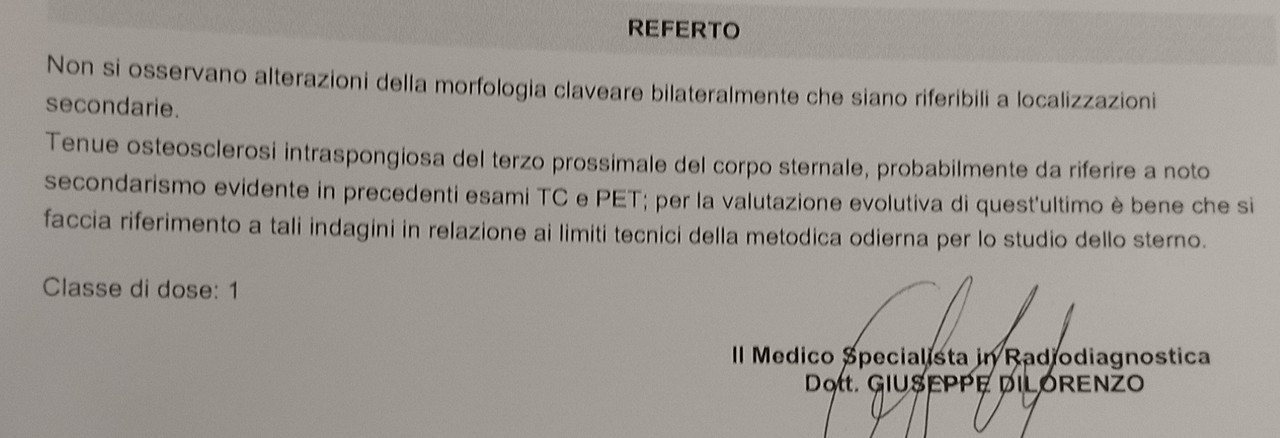 Il radiologo mi ha spiegato che per la zona dello sterno ha visto che l' osso si sta calcificando, perché lui conosce il mio problema,e mi ha spiegato che è una cosa positiva, significa che la radioterapia e le cure stanno facendo il loro lavoro.