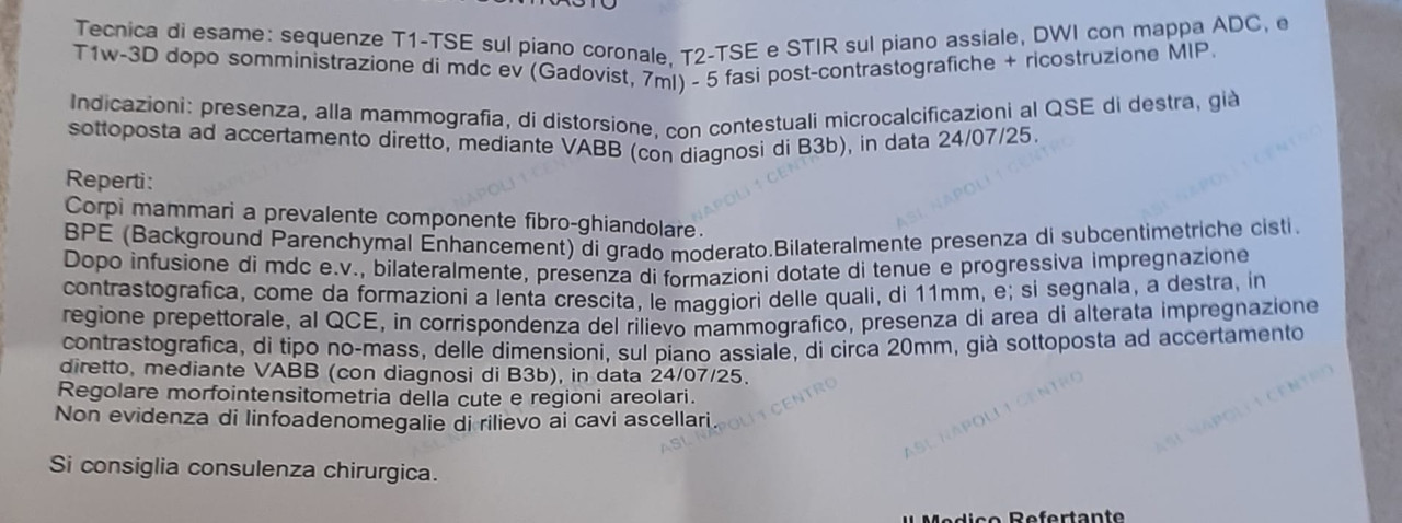 C'è poco da aggiungere B3 : DUBBIO, PROBABILMENTE BENIGNOMi scusi ma dopo Mammografia con tomosintesi 2 ecografie una biopsia Vabb con asportazione di 12 frustoli da 2 zone diverse del seno una risonanza con contrasto hanno ancora dubbi? Perchè allora dirmi tutto ok non è un tumore togliamo in via preventiva? Mi scusi lo sfogo personale ma è da Aprile che mi sento come in un limbo ed a questo punto l'istologico potrebbe rivelare anche un carcinoma?